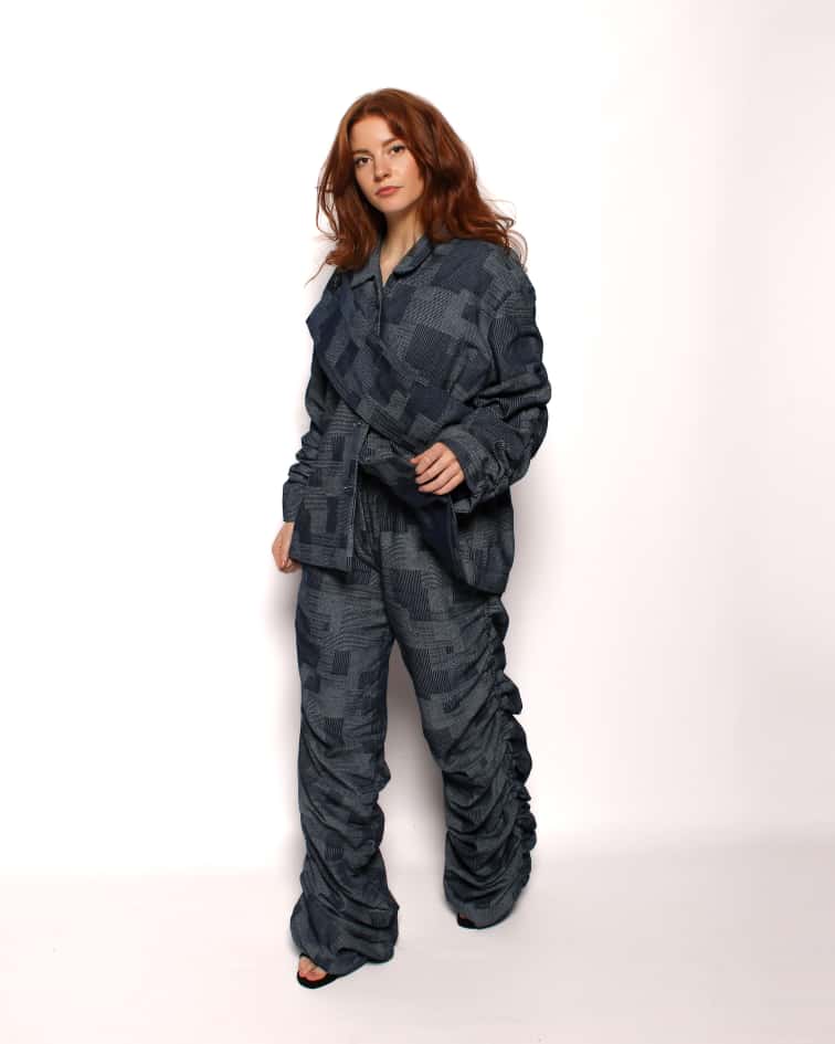 This Jacket is suitable to combine with the Pattern Pleated Denim Trousers. The pleats refer to the growth that you go through as a woman to discover your own identity. The jacket has an oversized fit. The pleats have an artistic effect in this Jacket.