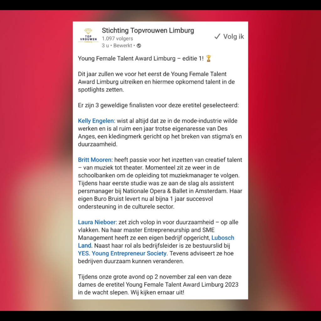 NOMINATION YOUNG FEMALE TALENT AWARD LIMBURG 2023 – STICHTING TOPVROUWEN LIMBURG